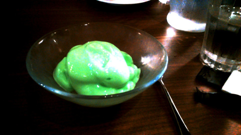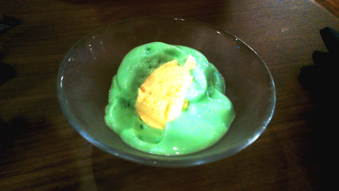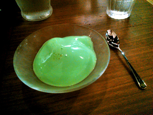 飲み物が出てくると思っていたら、緑色の物体が…、びっくりです。実際は写真よりももっと黄緑色をしています。
