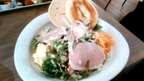 サラダランチです。ベーグルとハムにたっぷりの野菜。かなりヘルシーです♪