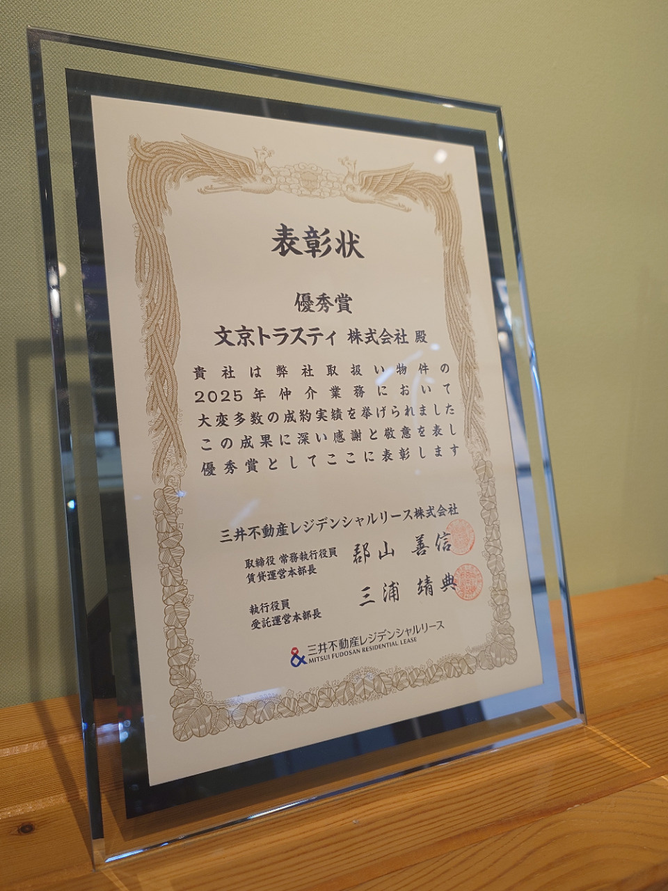 三井不動産レジデンシャルリース株式会社様より、表彰を受けました。